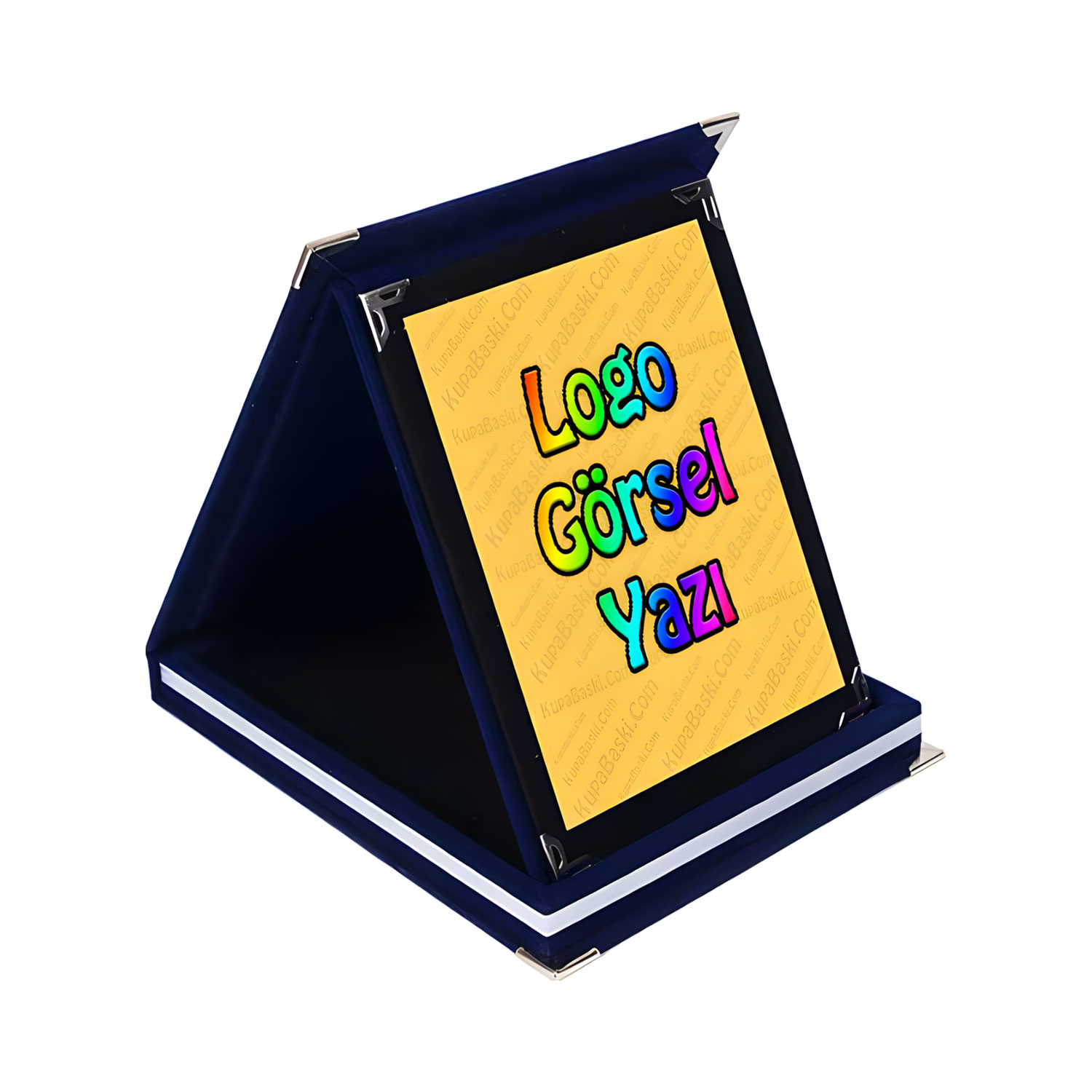 Lacivert kadife plaket baskı siparişiniz arzu ettiğiniz renklerde logo, görsel ve yazı baskılı olarak gönderilmektedir.